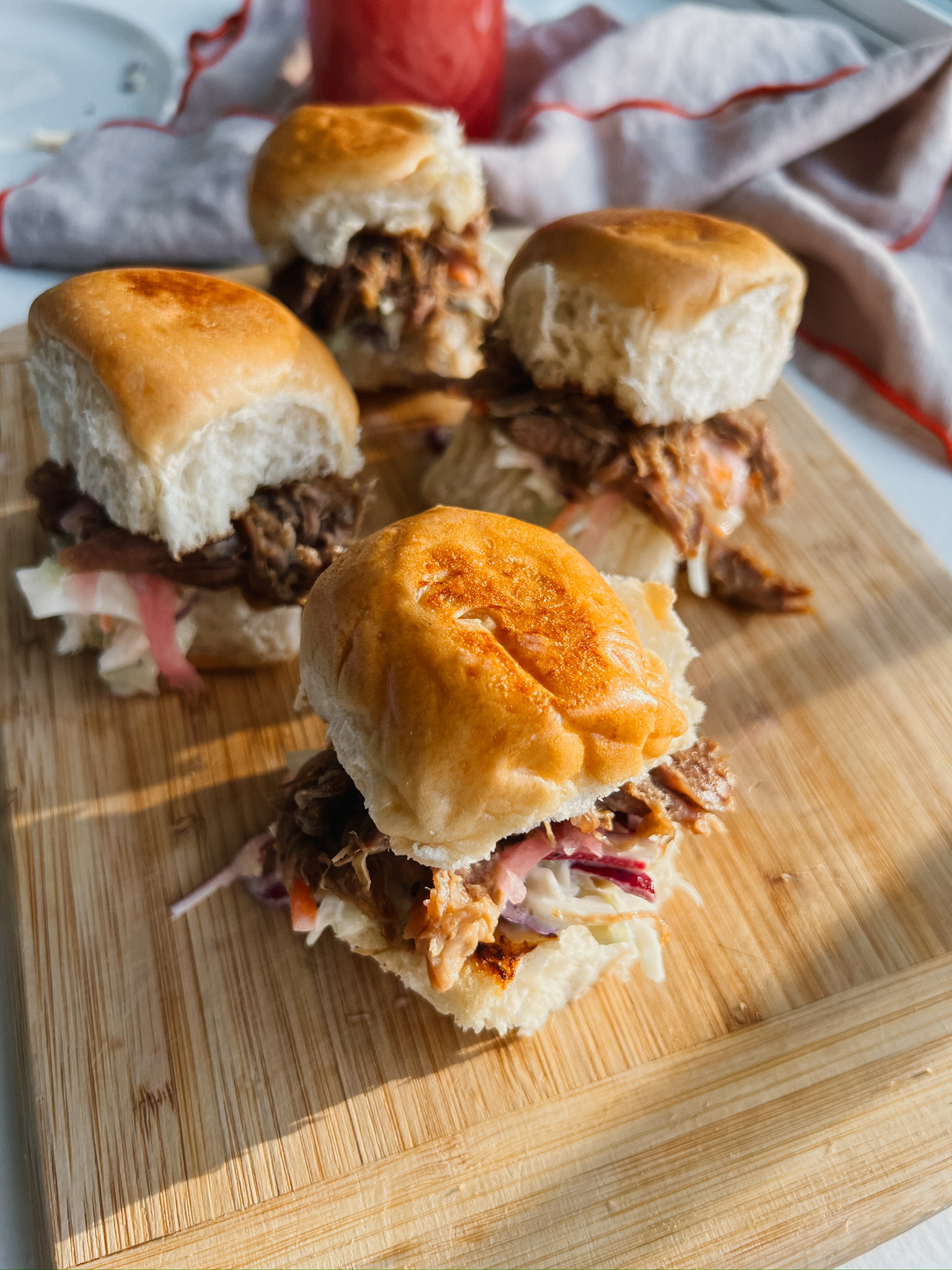 For sandwiches, toast your Hawaiian buns by adding a thin layer of mayo inside and cooking in a hot pan for about 2 minutes or until golden brown. Assemble your sandwich by adding a scoop of coleslaw (recipe below), pickled onions, and pulled pork. Then get ready to devour!