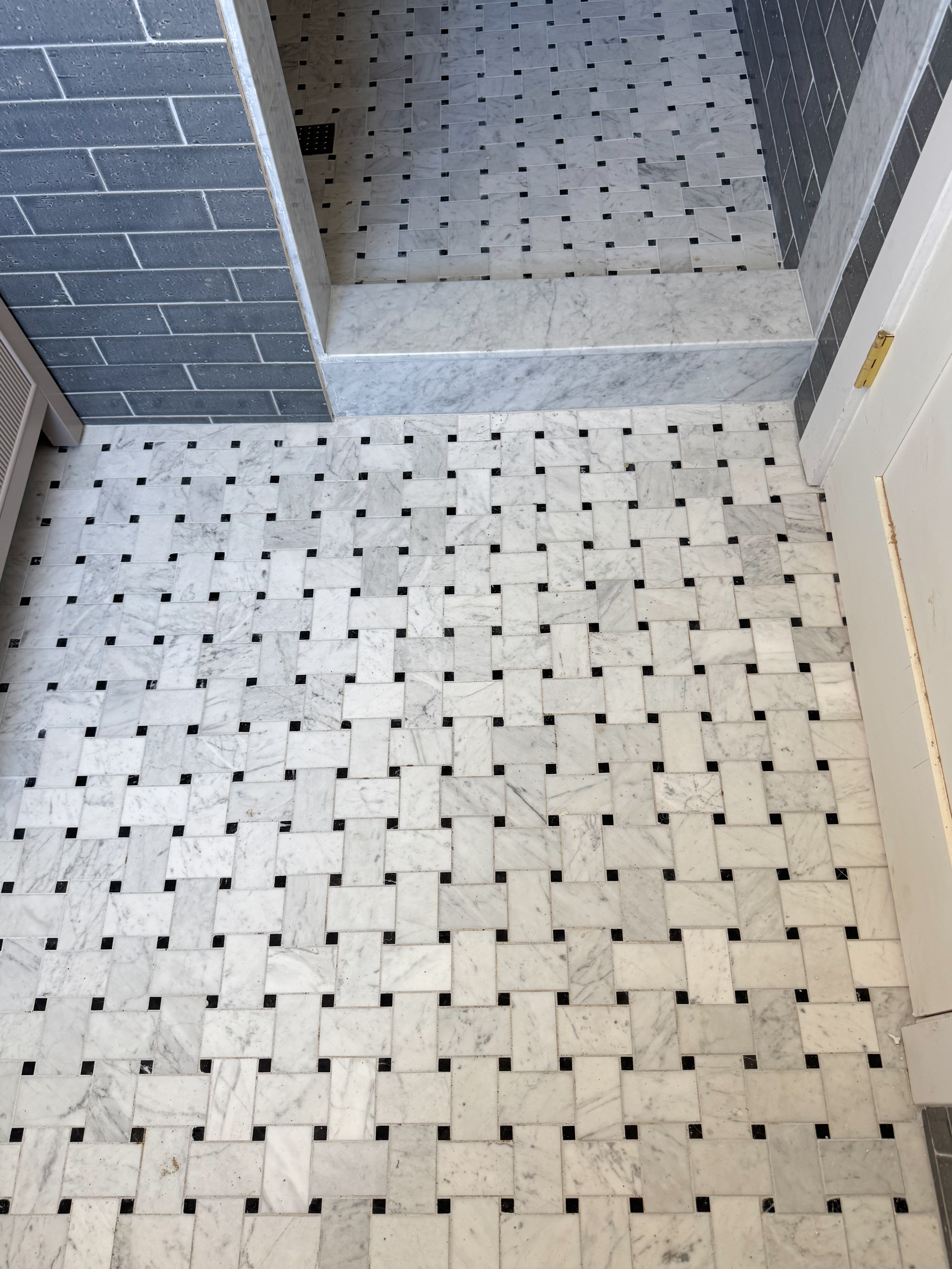 The Anthology French Gray tile pairs perfectly with marble! I knew right away what floor tile I wanted to use. I had already used the Jumbo Basketweave Marble Tile from Bedrosians in our powder room, and knew it would be perfect for this bathroom as well. It is such a classic design that will never go out of style! I love the jumbo basketweave design. It’s a nice twist on the usual smaller basketweave design. You can custom order the French Gray and Matisse Habitat Anthology tile from Bedrosians. I ran the Jumbo Basketweave tile into the shower floor. I always like to do that. Gives the space a nice flow and make the room feel bigger.