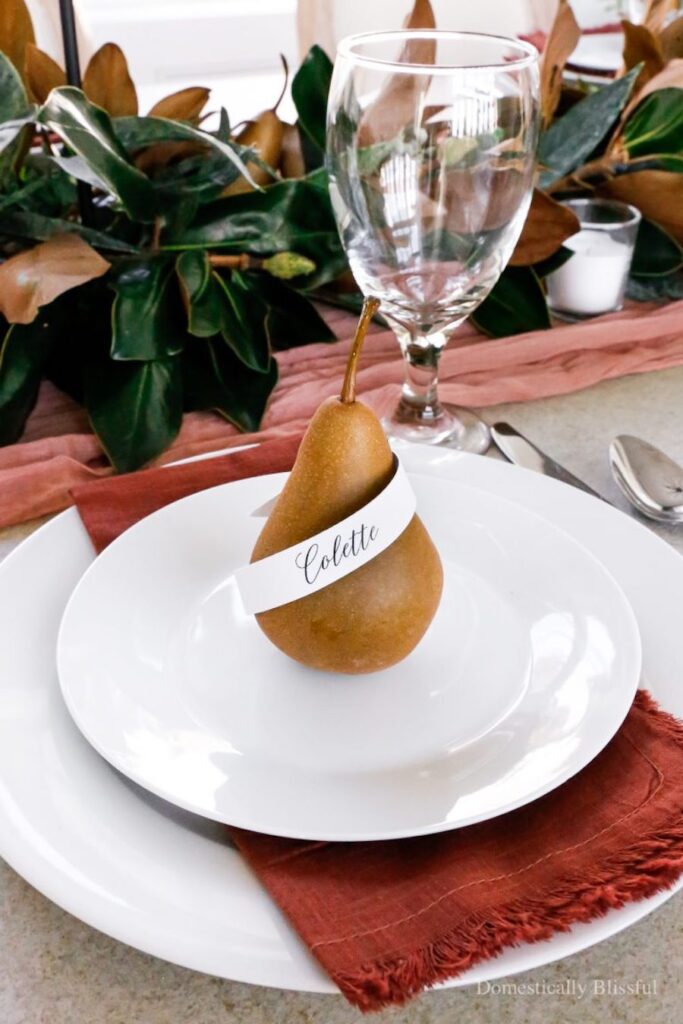 Small, thoughtful details go a long way. Handwritten place cards, a short gratitude note at each seat, or a small favor (like a pear or a cookie wrapped in twine) can make your guests feel welcomed.