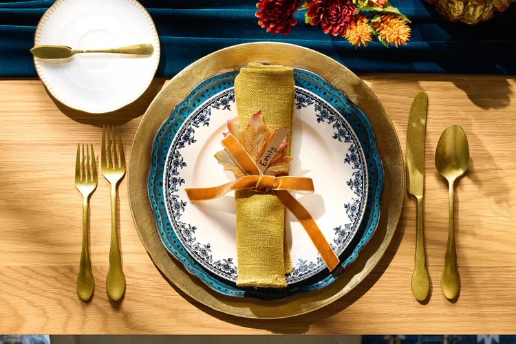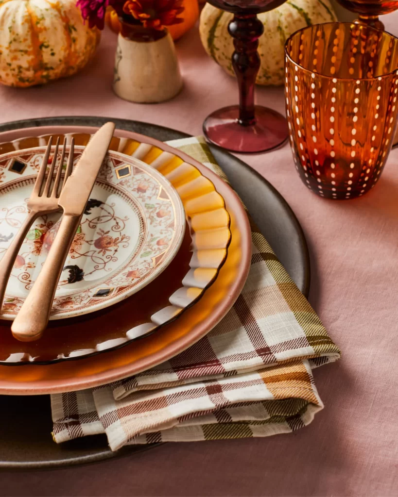 However you style it, starting with a good base makes the rest of your tablescape come together effortlessly. A tablecloth is a great option for a beautiful foundation. It sets the mood, adds texture, and helps pull the whole look together. Think of it as the stage for everything else on your Thanksgiving table. Go for something simple and neutral if you like a clean look, or pick a print to make a statement. Plaid, stripes, or floral designs are popular print selections. If you have a wood table you love, you can opt for placemats or a table runner to show it off.